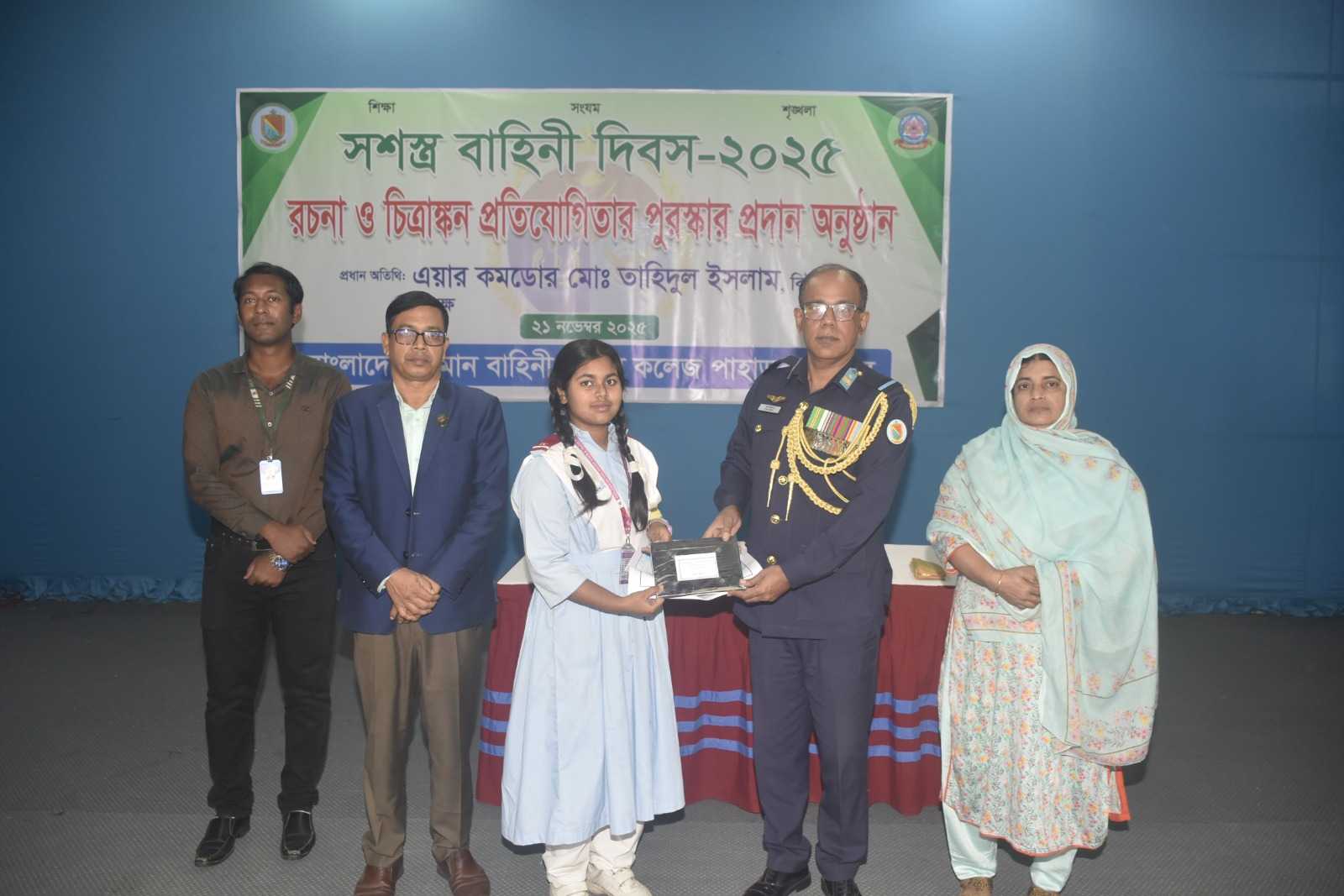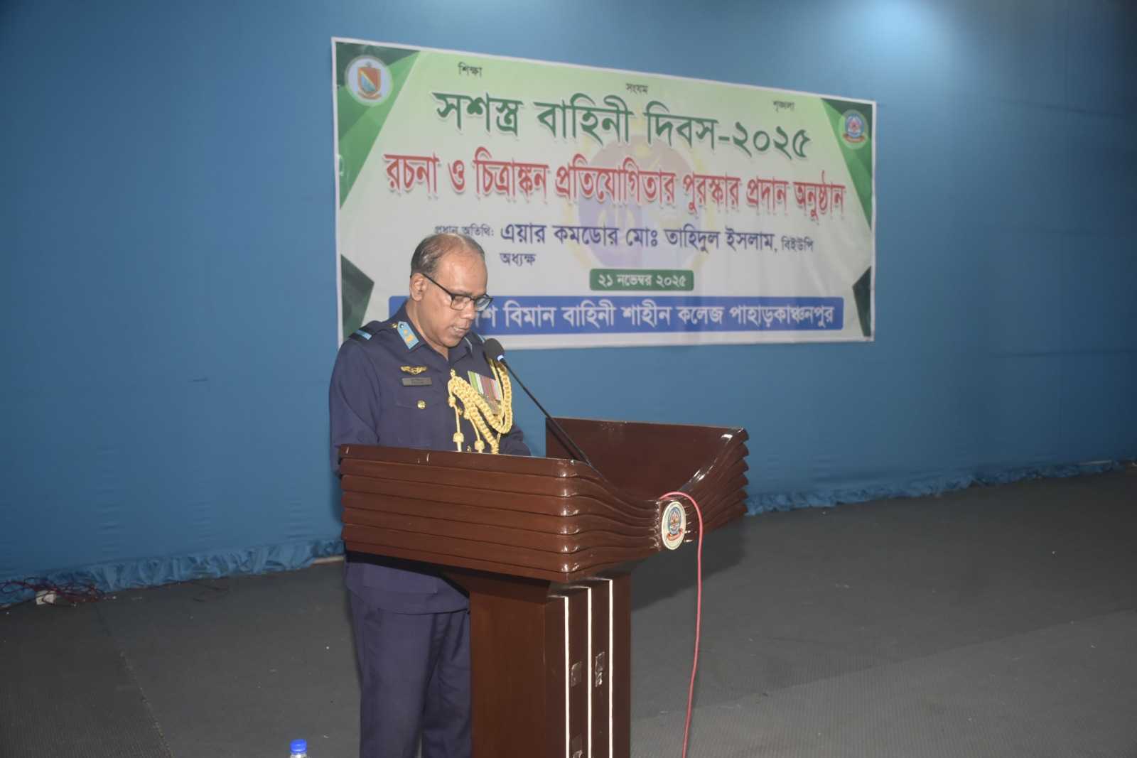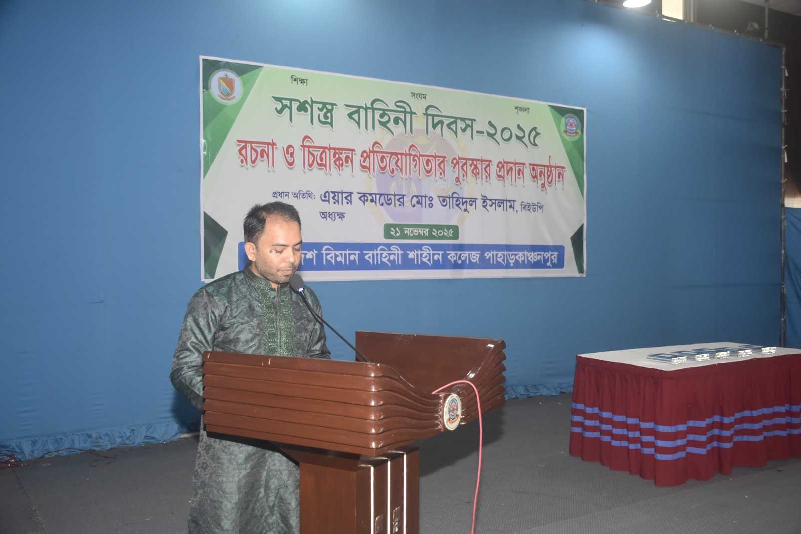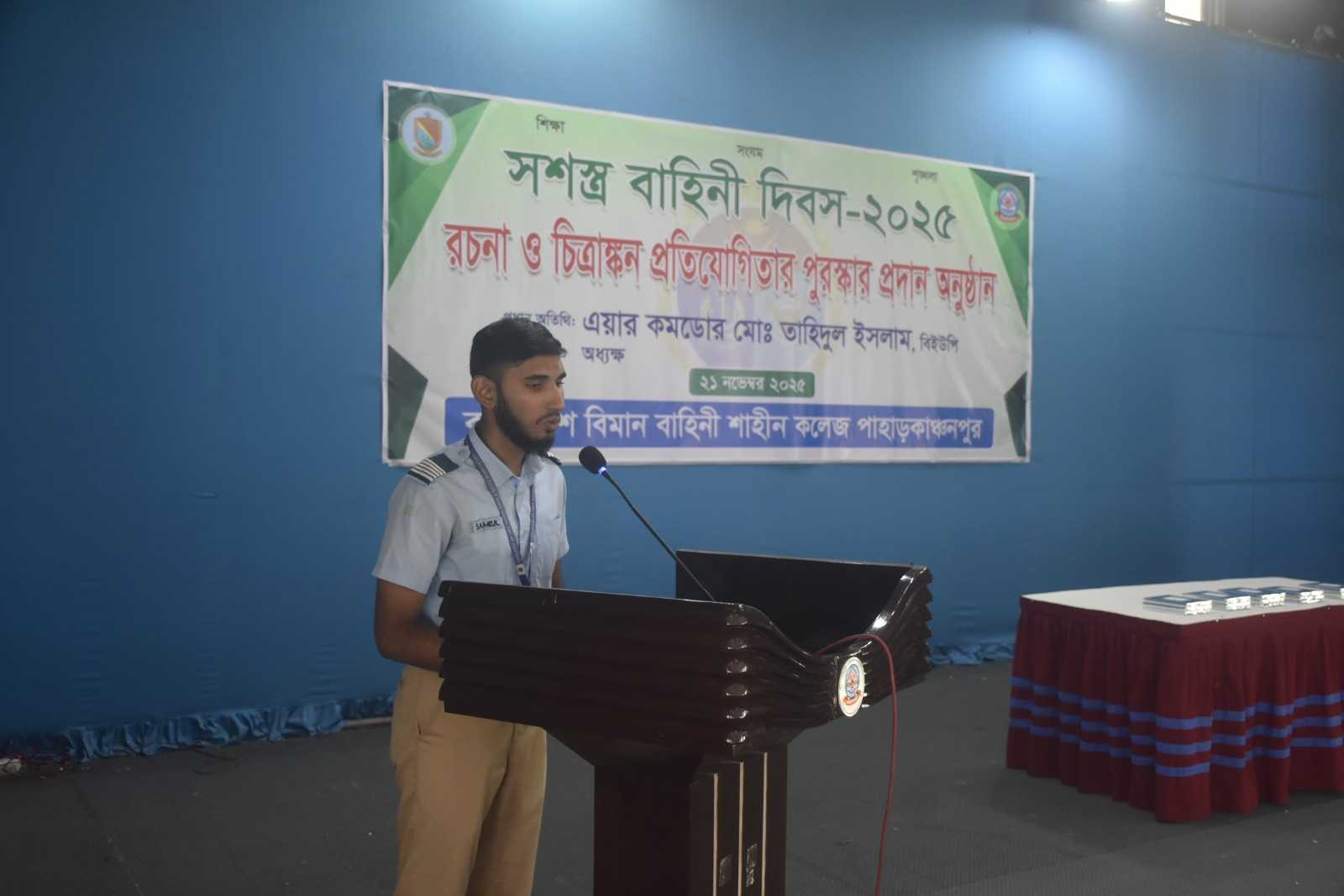 সশস্ত্র বাহিনী দিবস উপলক্ষে বাংলাদেশ বিমান বাহিনী শাহীন কলেজ, পাহাড়কাঞ্চনপুরে এক বর্ণাঢ্য ও তাৎপর্যপূর্ণ আয়োজন অনুষ্ঠিত হয়। জাতির গৌরবময় এই দিনটিকে স্মরণীয় করে রাখতে কলেজ কর্তৃপক্ষ শিক্ষার্থীদের অংশগ্রহণে বিভিন্ন সৃজনশীল ও শিক্ষণীয় কার্যক্রমের আয়োজন করে। এর মধ্যে চিত্রাঙ্কন এবং রচনা প্রতিযোগিতা বিশেষভাবে উল্লেখযোগ্য, যা শিক্ষার্থীদের মেধা, মনন ও সৃজনশীলতাকে বিকশিত করার এক অনন্য সুযোগ সৃষ্টি করে।