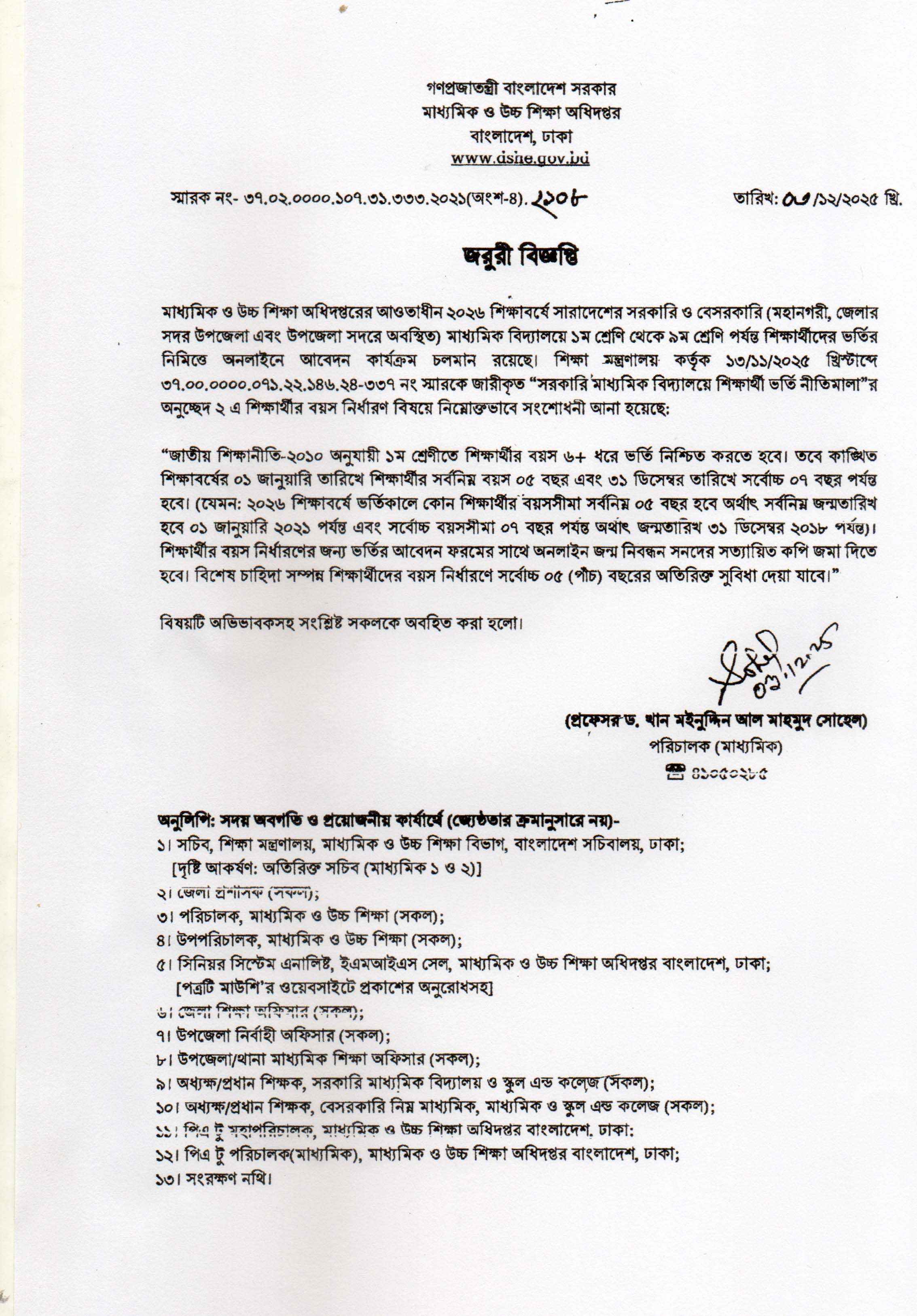 ২০২৬ শিক্ষাবর্ষে শিশু থেকে ৯ম শ্রেণি পর্যন্ত ভর্তির আবদনের বয়সের সংশোধিত নীতিমালা