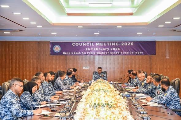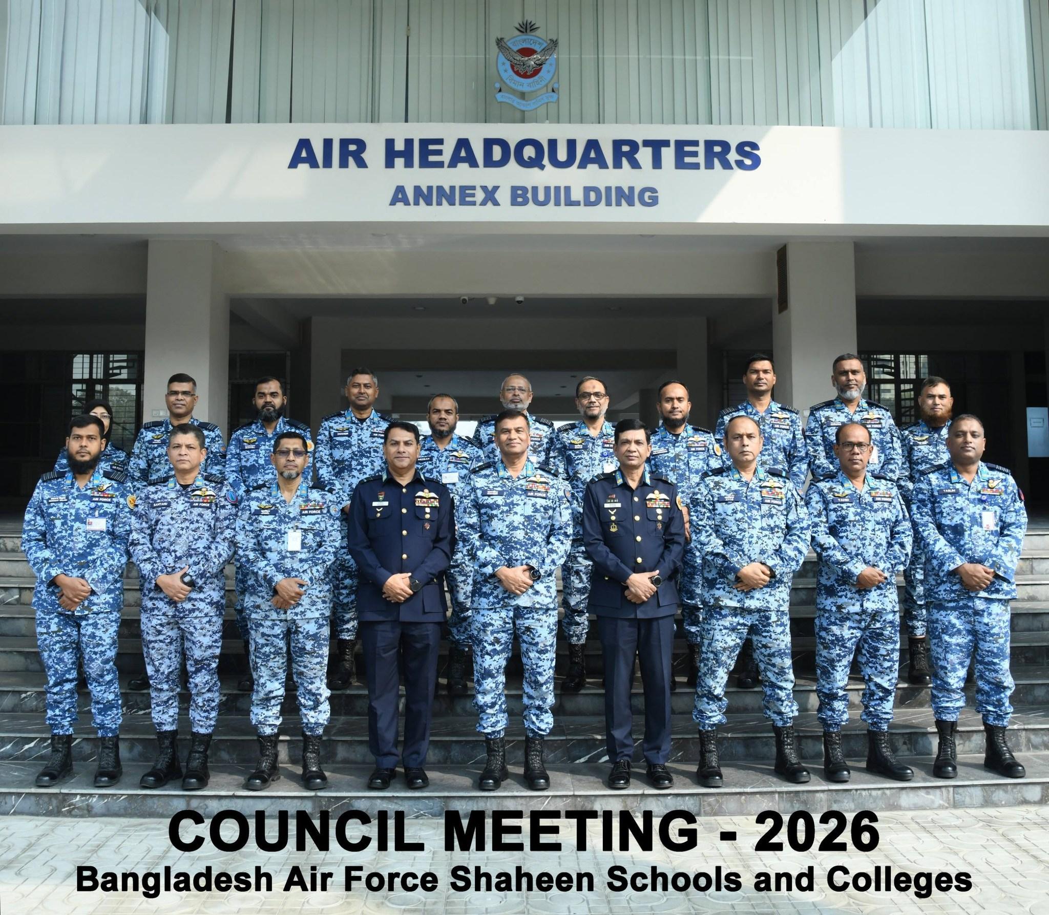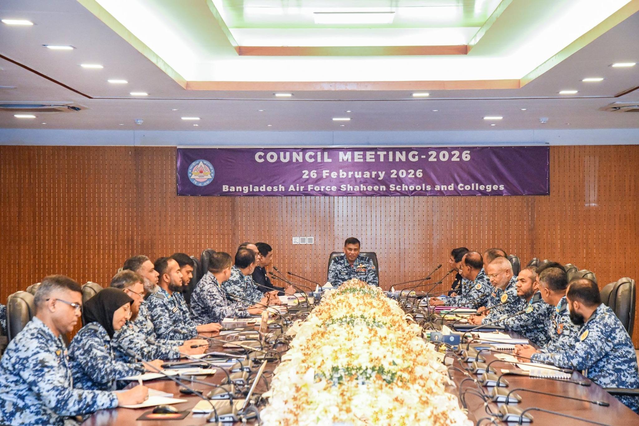 গত ২৬ ফেব্রুয়ারী ২০২৬ তারিখে বাংলাদেশ বিমান বাহিনী শাহীন স্কুল ও কলেজসমূহের কাউন্সিল মিটিং -২০২৬ ঢাকা সেনানিবাসস্থ বিমান বাহিনী সদর দপ্তরে অনুষ্ঠিত হয়। গুরুত্বপূর্ণ এ সভায় সভাপতিত্ব করেন সহকারী বিমান বাহিনী প্রধান (পরিচালন) এয়ার ভাইস মার্শাল জাভেদ তানভীর খান, ওএসপি, বিএসপি, এনডিসি, এএফডব্লিউসি, এসিএসসি, পিএসসি। বাংলাদেশ বিমান বাহিনীর সরাসরি তত্ত্বাবধানে পরিচালিত সকল শাহীন স্কুল ও কলেজসমূহের শিক্ষা কার্যক্রমের অগ্রগতি পর্যালোচনা এবং ভবিষ্যৎ উন্নয়ন পরিকল্পনা নির্ধারণের লক্ষ্যে এই ‘কাউন্সিল মিটিং- ২০২৬’ অনুষ্ঠিত হয়। সভায় প্রতিষ্ঠানের সামগ্রিক মানোন্নয়ন এবং আধুনিক বিশ্বের চ্যালেঞ্জ মোকাবিলায় শিক্ষার্থীদের প্রস্তুত করার বিষয়ে বিশেষ গুরুত্বারোপ করা হয়।